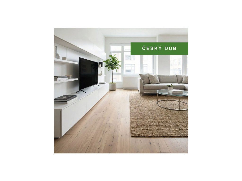 Třívrstvá dřevěná podlaha  Český dub mírně bělený s přirozenými charakteristiky dřeva. Čistý a moderní vzhled se kombinuje s povrchovou úpravou extra kartáč, díky čemuž podlaha získává na své kráse. Přestože se jedná o zesvětlený dekor dřevěné podlahy, podlaha nepůsobí uměle, ale zachovává si svůj vizuální vzhled původního dřeva. Ideální podlaha do moderních interiérů bytů, rodinných domů a rekreačních staveb.